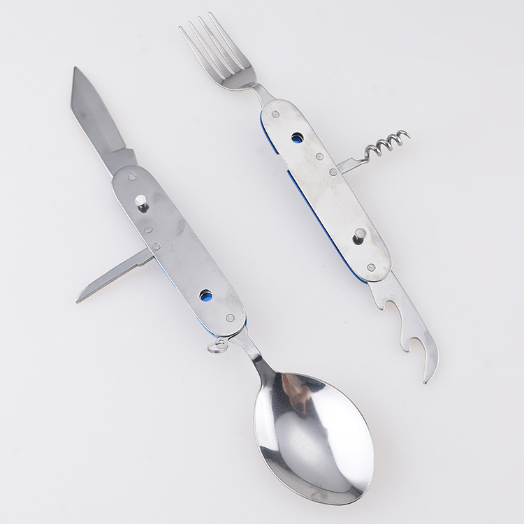 Functions: 8 in 1 -Knife -Spoon -Fork -Bottle opener -Can opener -Corkscrew -Leather punch -Key ring